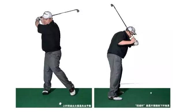 要确保站位宽度适合你本人的体型。上杆不要转动过大,不然会造成下杆向外扔杆,重心移到脚尖,导致触球失去平衡,球自然也打得很糟糕了。