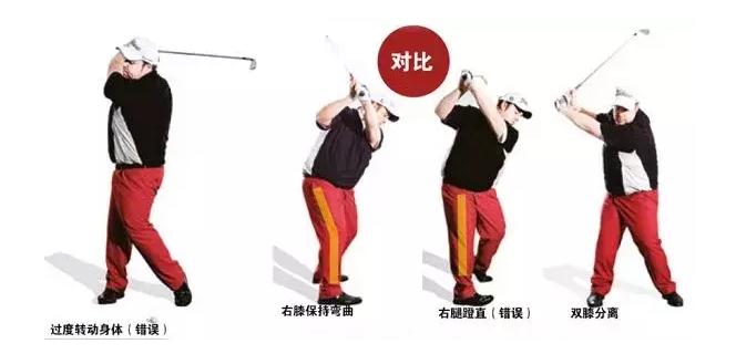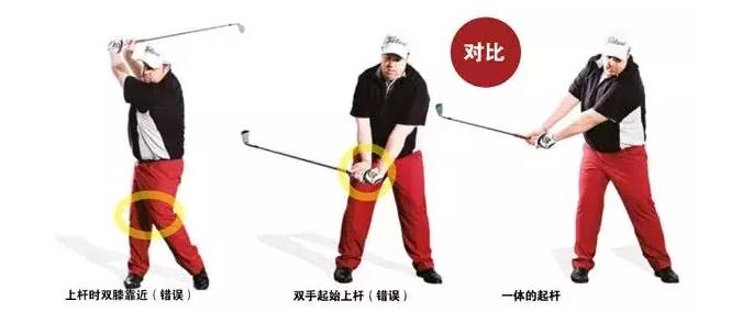 √2、很多人说在挥杆前要放松,事实上挥杆中需要的不是放松,身体要紧张,下半身要抵制住上半身的转动,这要求下半身要稳固、绷紧并支撑住挥杆时的身体转动。如果双腿放松,上杆时双膝就会靠近,造成上过度转动,形成无法掌控的大幅上杆。