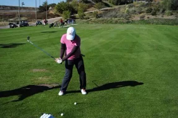 这和初学者总想看自己到底打多远有关系,击球后,马上抬头看球,导致没有完成整个挥杆动作。