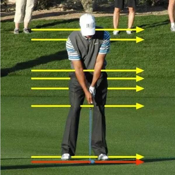 如果挥杆前,身体各部位的校准状态不正确就容易在后继挥杆的过程中引发这样那样的问题。比如说,站位时身体瞄向目标线右侧,那么就在引杆时把球杆挥向目标线内侧,形成较为扁平的挥杆平面。反之,如果把身体瞄向目标线左侧,就会将球杆挥向目标线外侧,形成较为陡峭的挥杆平面。