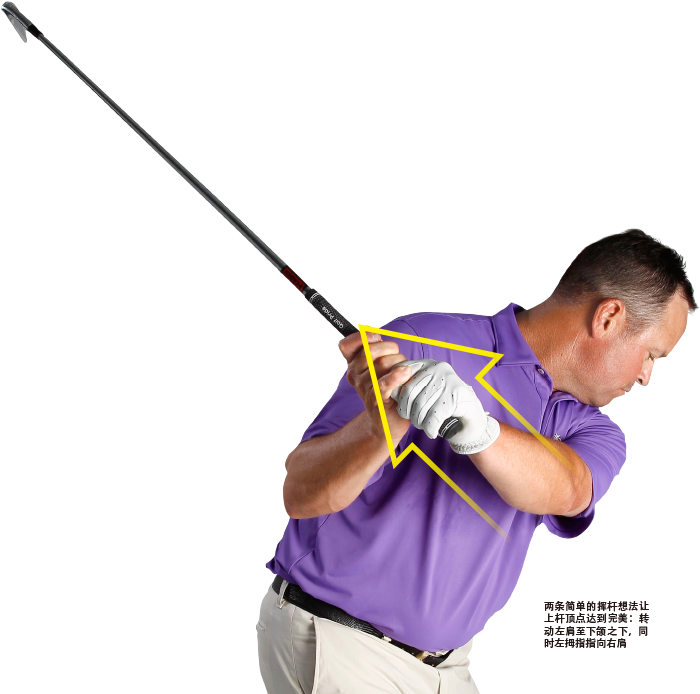 总之,这两条可以消除你曾有过的90%的上杆错误,并在上杆顶点时让杆身和杆头处于正确的挥杆平面,并准备好形成有力的击打。