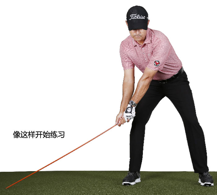 拿一支校准棒,把末端放在目标线向后的延长线上,大约在球后5英尺。这重现了在典型 的1号木杆挥杆中抵达击球区时的身体姿势。接下来,移动重心至左脚,同时向前挥动校准棒 。重要的是:利用左脚下的压力和双手全程给校准棒“加压”。应感觉好像你正在向目标右侧略 微弯曲和拖拽校准棒,同时还用左脚向下压。