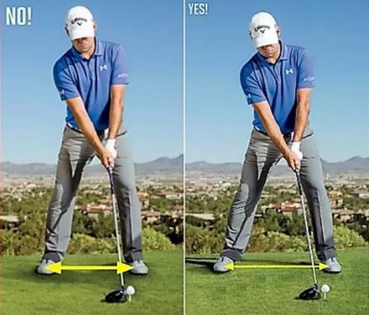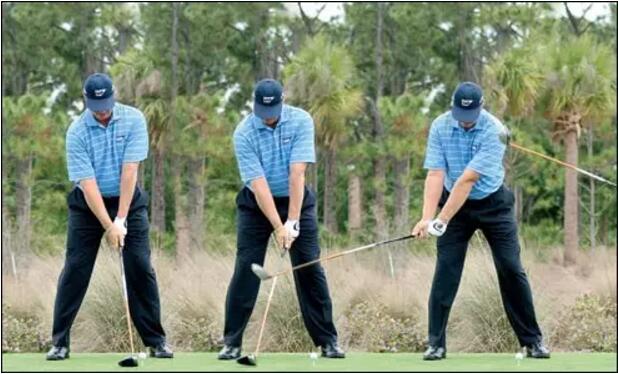 首先,我们从站位说起。站位时比平时略宽一些,以获得稳固的支撑来承受强大的挥杆力量。并且,身体重心要更多的置于右脚(约60%),这是为了让身体的旋转更充分。当身体的旋转越多,所积攒的挥杆力量就会越大。