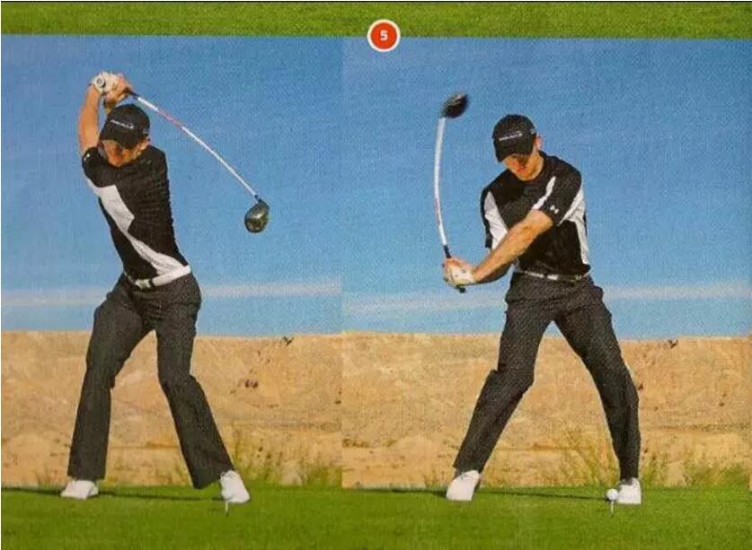 这里有一个“魔力动作”,开始下杆的时候,在将身体重心向左脚转移的同时带动右肘向身体一侧靠近。不过,需要注意的是,这是一个动作,而不是两个动作。它不仅可以帮助我们完成力量的转换,还可以构建更好的挥杆轨迹。另外,在此阶段要保持手腕的弯曲角度,这是积蓄力量的关键。