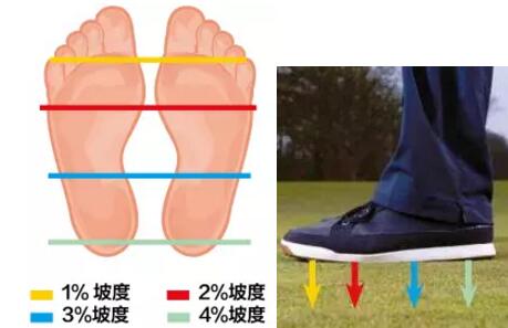面对上坡,在原地转动直至感觉比较平稳为止。可能会转动过多,可以往回转,务必找到平衡。判断重力停留在双脚的哪个位置,进而判断斜坡坡度。重心在脚趾,坡度则为1%,在前脚掌中心 处为2%,足弓处3%,脚后跟5%。