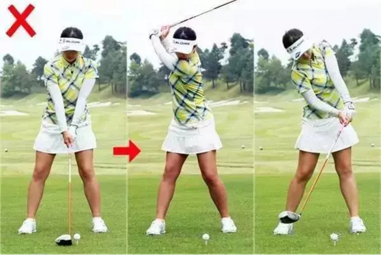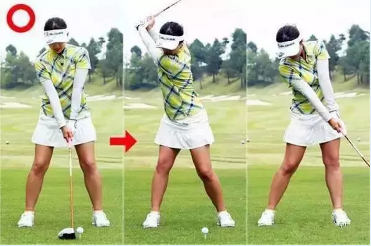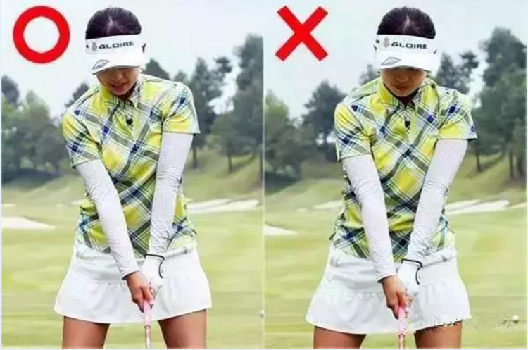 做准备姿势时,身体重心是左右对半分的,但是你的上身要稍稍右倾,这样子的话,从下杆到击球,再到最后的送球,才能很好地做到线条流畅。