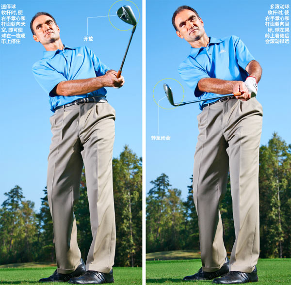 好球手知道决定劈起击滚动多少的在于收杆动作,使杆面开放、闭合会制造出两种截然不同的击球。下面是根据情况调整收杆的具体做法。