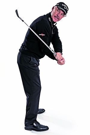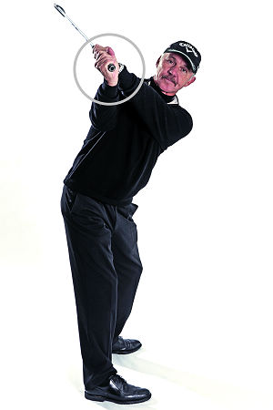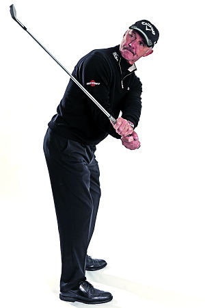 2. 当你上杆时,手肘会漂亮地抵住身体,让球杆沿着正确平面上移。