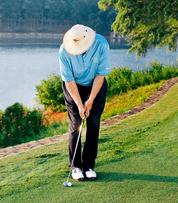 注意看,在上图中,我将重心置于稍偏前侧身体的地方,使球对准站位正中后方远端。这样能够确保触球时实现角度递减的击打,避免击中球后方的地面(打厚是最常见的切击失误)。握杆时双手下移,这使得你可以站得离球非常近,然后让球杆跟部离地。这样能够使左腕稍微向内翻转,有助于在挥杆过程中使左腕保持稳固,限制左腕上翘幅度。站得离球近一点还有助于在下杆时使球杆沿着目标方向线移动,让你更好地控制击球方向。
