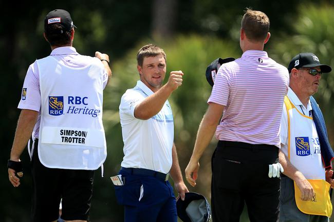 星期五早上,他们在RBC传承高球赛上交替抓鸟,直到辛普森在最后一个洞推入6英尺推杆,笑到最后。他打出65杆,低于标准杆6杆,进入周末的时候领先德尚博(64杆)和科里-康纳斯(63杆)一杆。