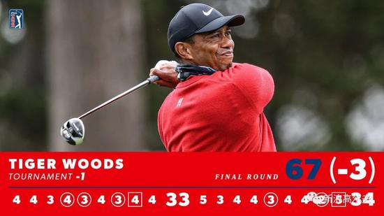 泰格-伍兹在最后一轮终于找回开球和推杆的状态,抓到5只小鸟、吞下2个柏忌,交出四轮比赛最低杆:67杆(-3),总成绩279杆(68-72-72-67),排名37位。