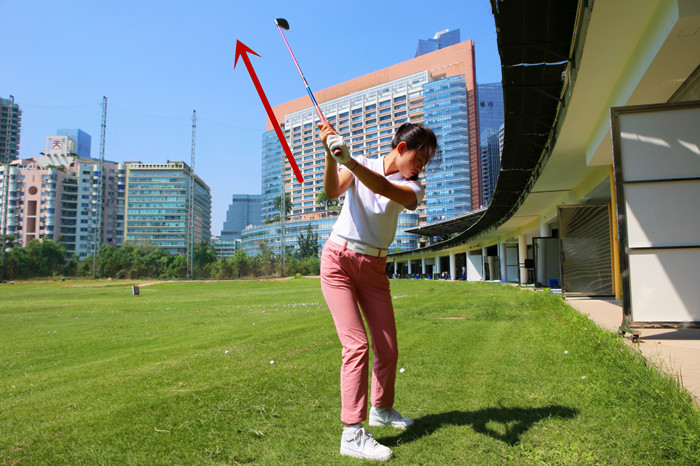 下杆过程中,让髋部先于肩部向目标方向转动,这样做会增加肩部和髋部在上杆中形成的紧张感,从而更流畅地引领双肩、双臂和双手向目标方向移动。这是整个下杆的关键。