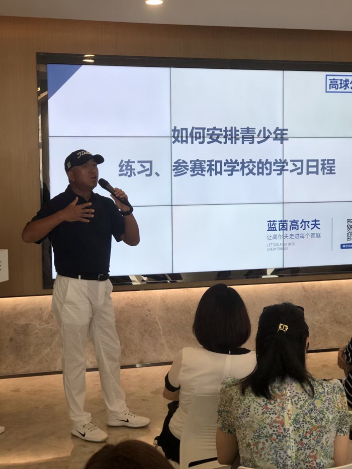 最后上场的是来自蓝茵高尔夫的陆文龙教练。演讲中,陆教练不仅为现场观众详细讲解了孩子学习高尔夫应该如何开始,更向大家表达了自己的观点:培养孩子学习高尔夫,也是一种多元化的理财模式。